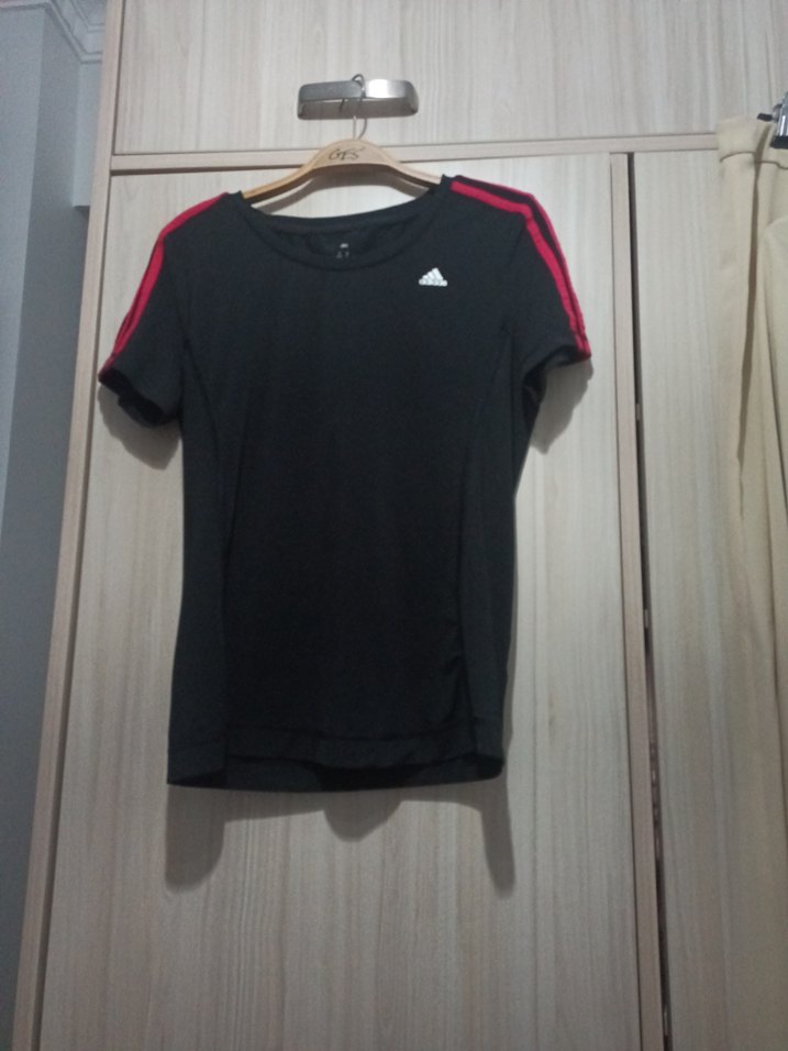 Koyu siyah, kısa kollu, dar kesim kadın spor tişörtü. Bisiklet yaka ve omuzlarda kırmızı şeritler bulunur. Sentetik kumaştan, baskılı ve cırt cırtlı detaylı.