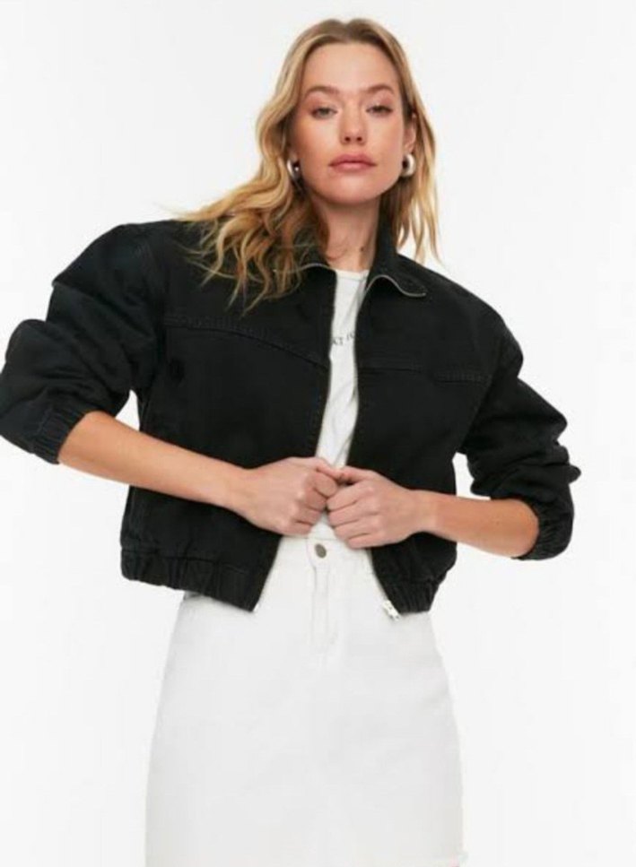 Siyah renkli, uzun kollu, yuvarlak yakalı, bol kesim kısa kot ceket. Desensiz tasarımıyla günlük sokak stili için uygundur. Rahat ve şık bir görünüm sunar.