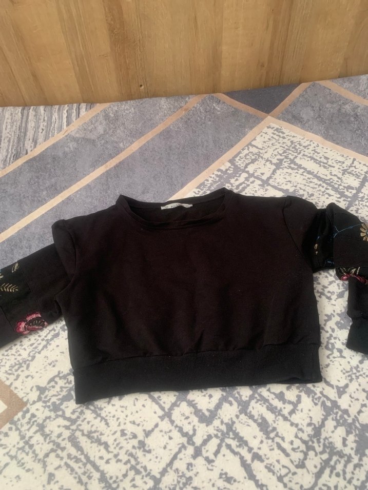 Uzun kollu ve bisiklet yaka, siyah renkli, yumuşak kumaştan kısa kesim, vücuda oturan kadın sweatshirtü. Günlük kullanım için rahat ve şık bir seçenek.