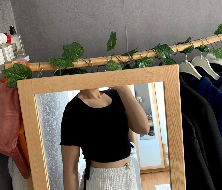Yumuşak keten kumaştan yapılmış, kısa kollu ve yuvarlak yakalı siyah dar kesim kısa tişört. Yanlarda bağcıklı büzgü detayı ile zahmetsiz şıklık sunar.