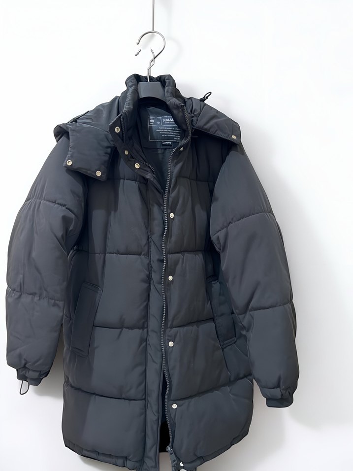 Fermuarlı ve çıtçıtlı önü ve kesilmiş yaka detayı olan, yumuşak ve sıcak kumaştan yapılmış, normal midi boyda, askılı kollu, fit kesim siyah kadın kışlık mont.