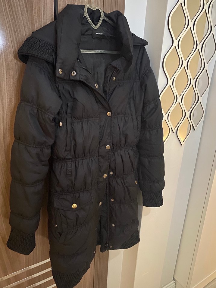 Mango siyah, 95 cm boy ,iki koltuk altı arası genişliği 47 cm kadın kışlık mont. Notlu yaka ve askılı kollara sahip, günlük kullanıma uygun rahat ve şık bir modeldir. ❄️