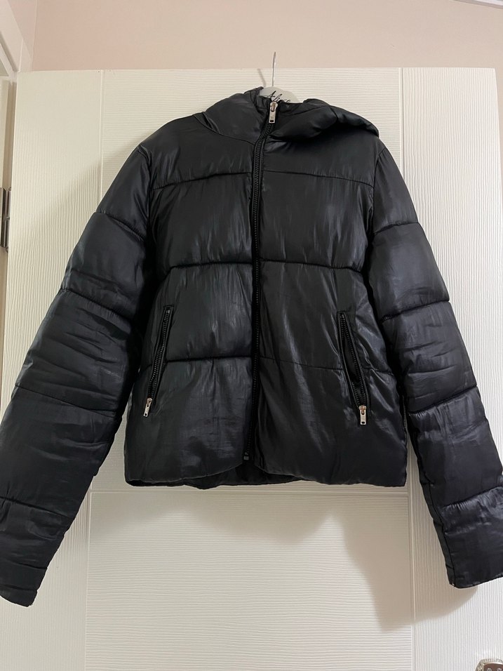 Siyah şişme, fermuarlı cepli,kışlık mont. Günlük kullanıma uygundur. Kolunda yırtılma var dikildi ama çok belli olmuyor kusurlarını ekledim.