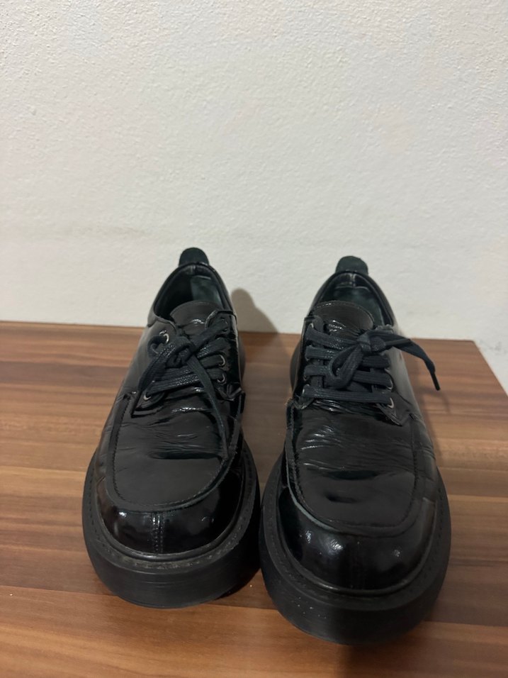 Siyah, desensiz kadın klasik ayakkabı, kauçuk tabanlı, rock punk havası ve ofis kullanımı için uygun.