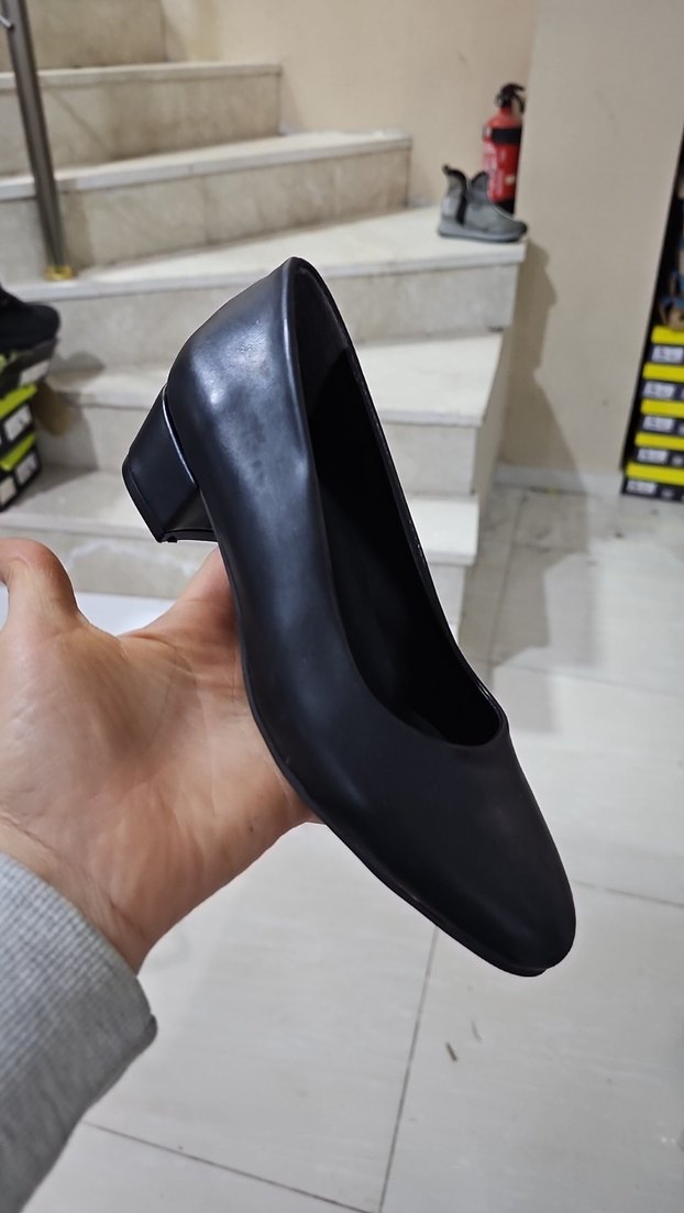 Siyah, kauçuk malzemeden blok topuklu kadın stilettoları. Ofis için uygun, klasik ve şık tasarımıyla zarif bir görünüm sunar.