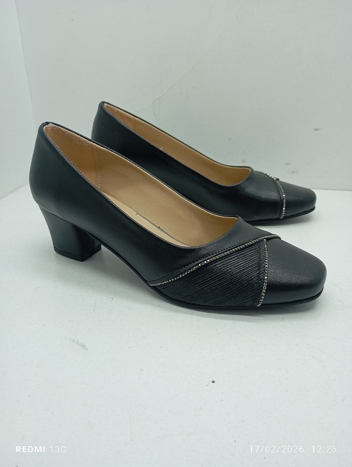Topuk boyu 5 cm kalıbı büyük bir numara küçük alınız Siyah renk, plise detaylı, blok topuklu klasik kadın ayakkabısı, ofis için uygun şık tasarım.
