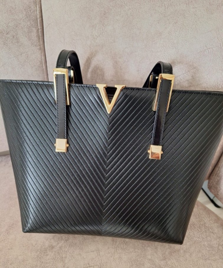 Siyah, fermuarlı, verev çizgi desenli kadın çantası. Modern klasik tasarımıyla günlük kullanıma uygundur. İçi 2 bölmeli 2 gizli cep ortada ayrı bölmesi vardır. Hiç kullanılmadı. En 38 Boy 26 Sap Uzunluğu 27 cm.