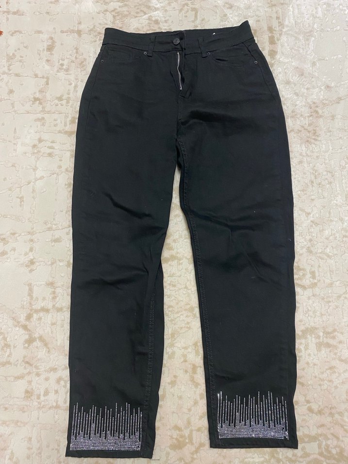 Siyah kot kumaştan, bol kesim kadın pantolon, paça kısmında taşlı detaylarla rahat ve günlük kullanım için uygun.