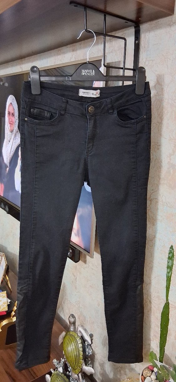 Siyah kot pantolon, liralı esnek vücuda oturan kesimdedir. Diz altı kenar kısmı deri detaylı rahat pantolon 28 beden ve 30 bedenede oluyor