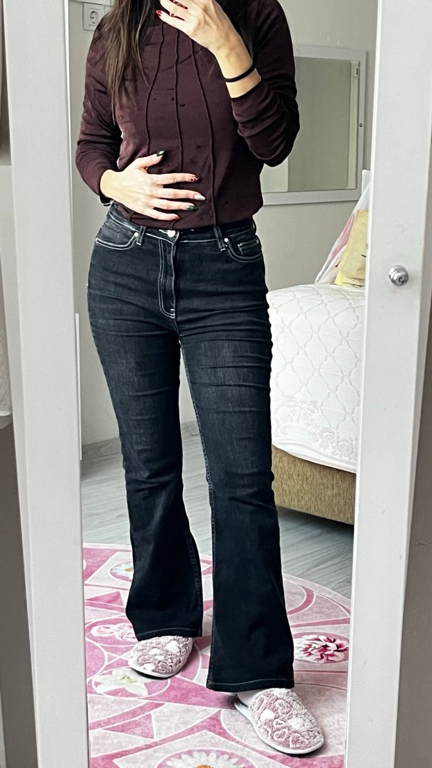 Düğmeli, siyah denim kumaştan yapılmış, normal boyda ve dar kesim kadın kot pantolon. Günlük kullanım için uygundur ve desen içermez.