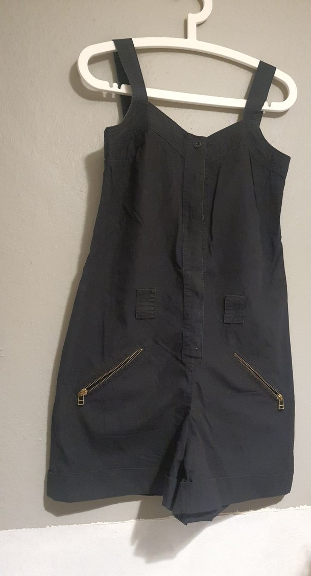 Siyah kot kumaştan, askılı, straplez kesim ve fermuarlı ceplere sahip, vücuda oturan kadın tulum.