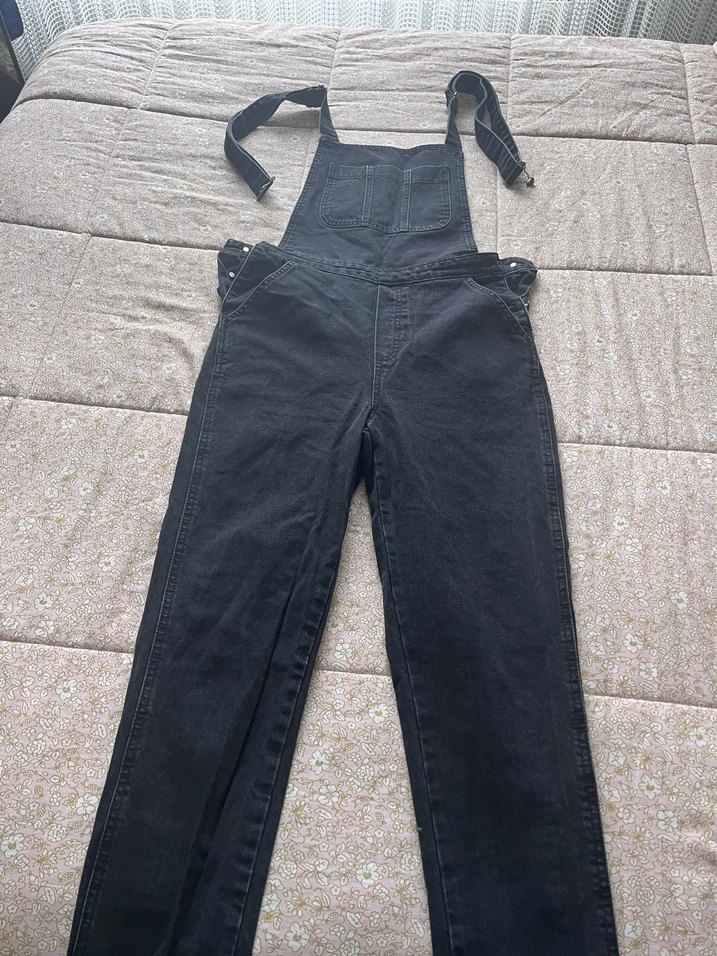 Siyah kot kumaştan yapılmış, askılı ve tokalı detaylara sahip kadın tulumu. Yüksek yakalı, normal boy ve rahat kesimlidir. Günlük kullanım için uygundur.