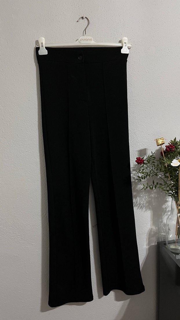 Düz siyah, kadın kumaş pantolon, sentetik yumuşak kumaştan, regular fit. Ofis ve günlük stil için uygundur.