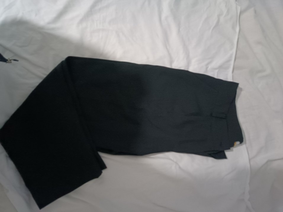 siyah, midi boy, sentetik kumaştan yapılmış kadın kumaş pantolon. Minimalist tarzda, günlük sokak giyimine uygun.