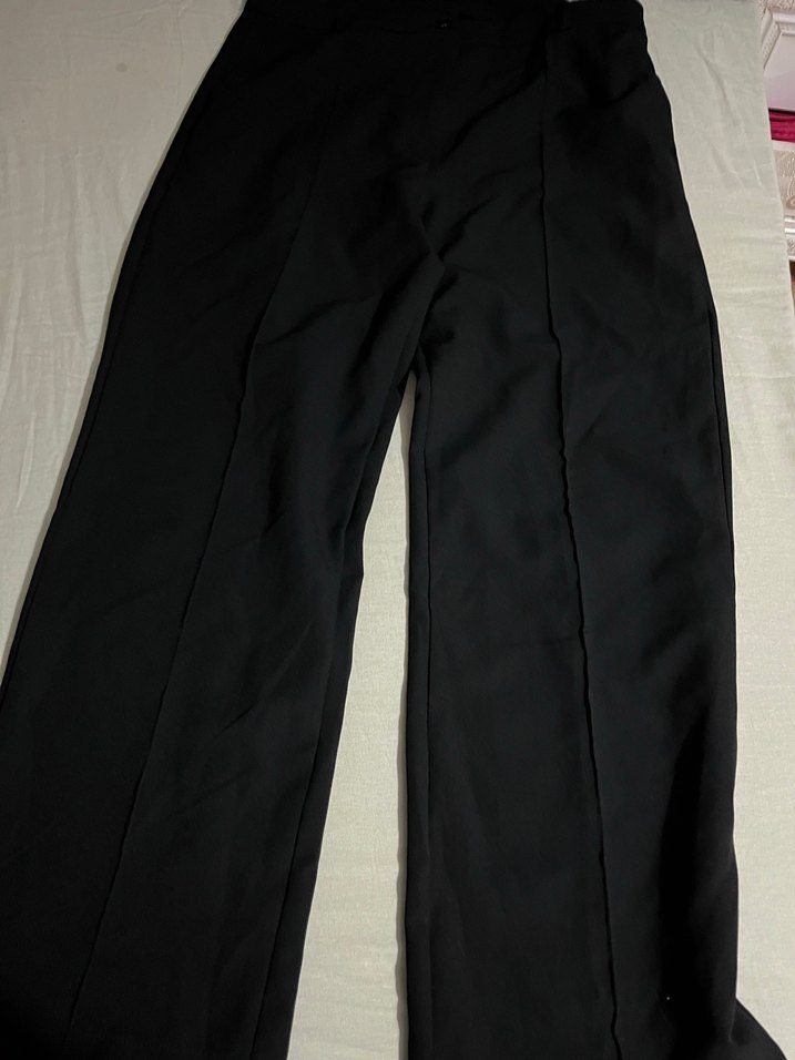 Siyah, regular fit ve uzun boy, yırtmaç detaylı kadın ofis pantolonu. İpeksi dokuda, iş ve sokak stili için uygundur.