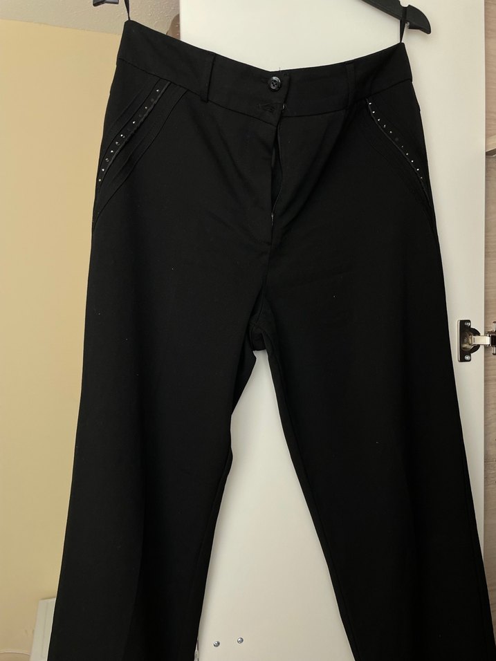 Siyah, ipeksi kumaştan, ceplerinde ince süslemeler bulunan, kadın pantolon. Ofis için goth iş tarzına uygun. Taşları düşmüş birazı