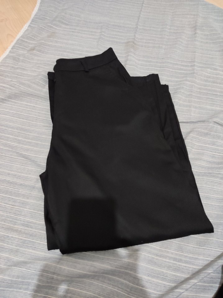 Düz siyah, kadın kumaş pantolon. Rahat kesim ve ipeksi dokusu ile günlük ve iş stiline uygun.