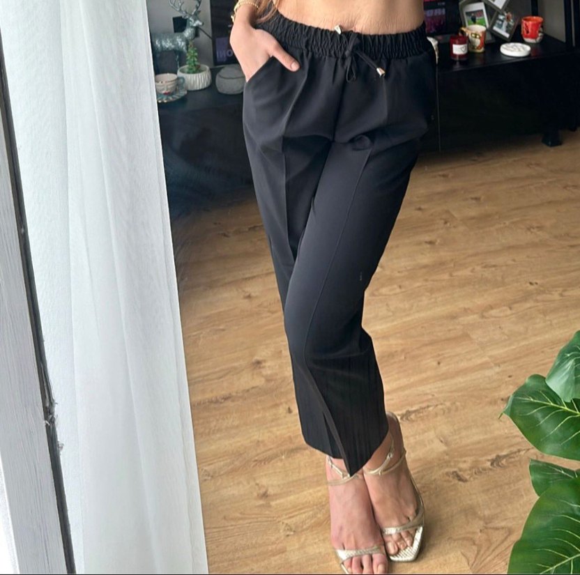 Siyah midi uzunlukta, regular fit kadın pantolon. İpeksi kumaştan, elastik bel bantlı, ofis ve sokak modasına uygun, zahmetsiz şıklık sunar.