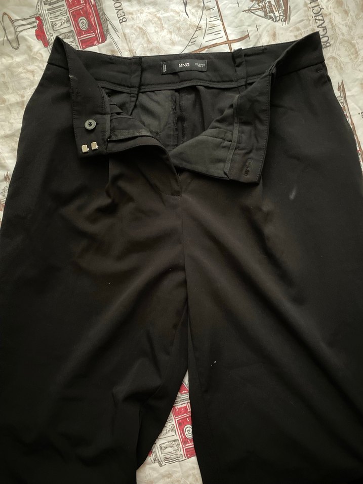 Düz siyah, , fermuarlı kadın kumaş pantolon. Pürüzsüz sentetik kumaştan, günlük sokak stiline uygun, Paris esintili. Mango