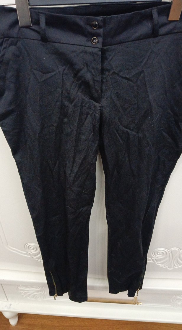 Siyah, yumuşak ve ipeksi kumaştan, bol kesim, fermuarlı detaylı kadın pantolonu, ofis kullanımına uygundur.