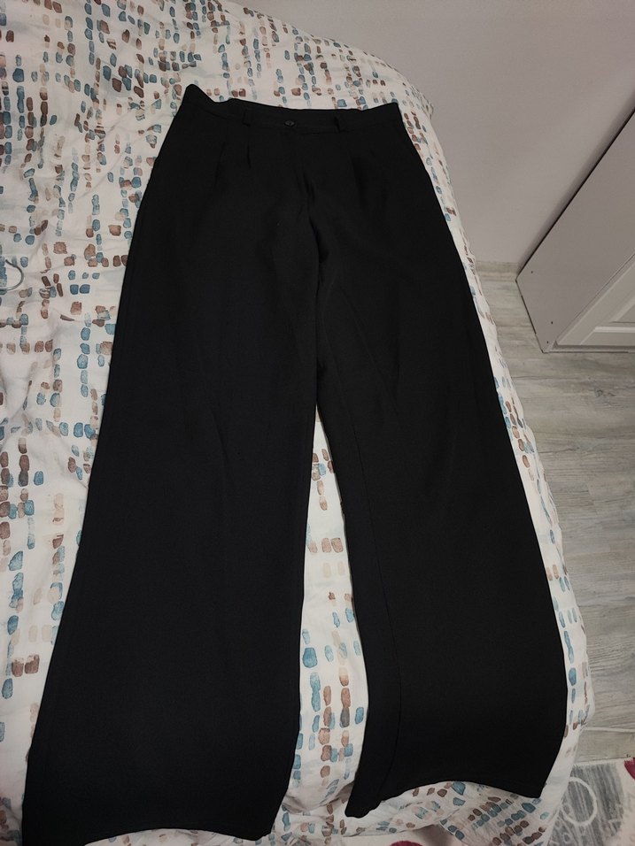 Siyah, uzun kesim, kemerli ve rahat kesime sahip kadın kumaş pantolon. Sentetik kumaştan üretilmiş, ofis ve günlük şıklık için uygun.