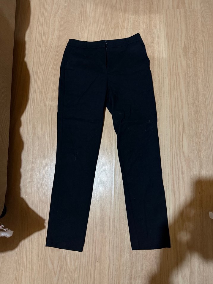 Siyah, düz desenli kadın kumaş pantolon, midi boy ve regular fit kesimle ofis için uygun şık bir tasarıma sahiptir.