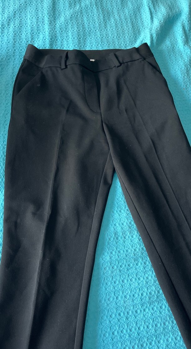 Siyah, düzenli kesim midi boy kadın kumaş pantolon. Pürüzsüz sentetik kumaştan, yırtmaç detaylı, ofis kullanımı için uygun.