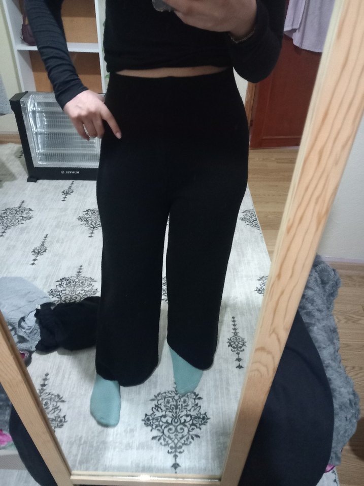 Siyah, midi boy, yumuşak ve sıcak kumaştan yapılmış, günlük kullanıma uygun, rahat ve şık kesim kadın pantolon.