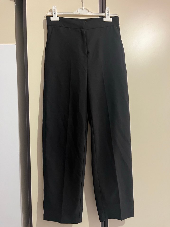 Siyah renkte, regular fit ve midi boy kadın kumaş pantolon. Sentetik kumaştan üretilmiş, ofis ortamı için rahat ve şık bir tercih.
