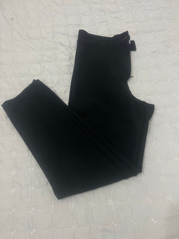 Siyah, midi boy, dar kesim kumaş pantolon. Yumuşak dokulu, ofis için uygun sade ve şık tasarım.