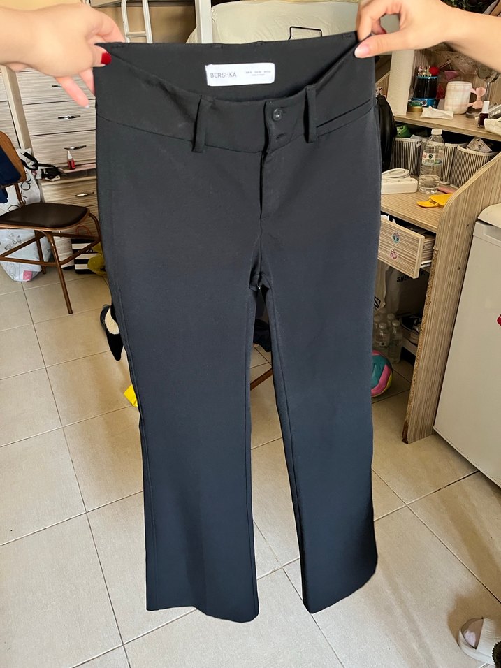 Siyah, kemerli, düz desenli, normal boy kadın kumaş pantolon.