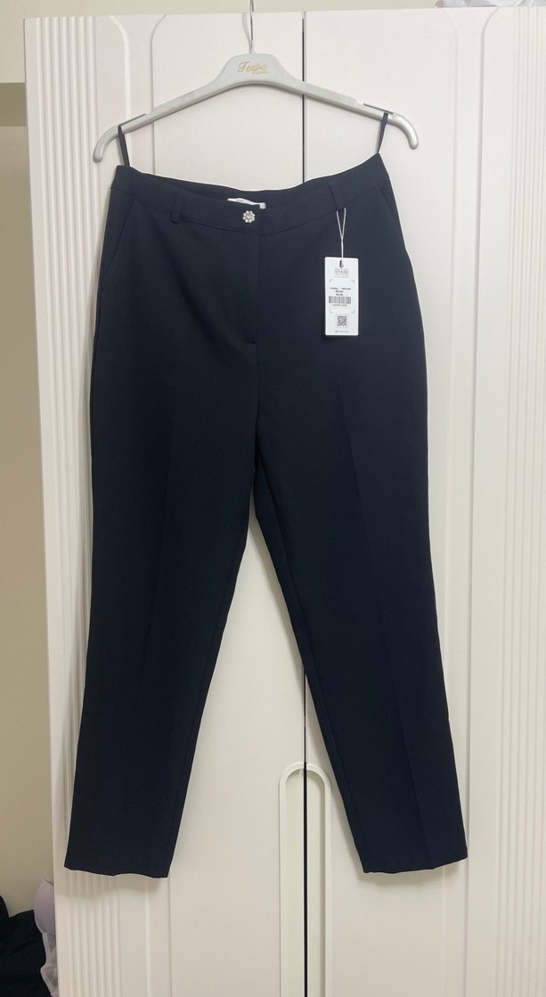 Düz siyah, normal boy midi kadın kumaş pantolon. Rahat kalıp ve düz kesimiyle ofis için şık ve rahat bir tercih.