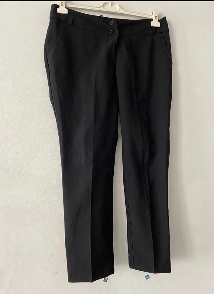 Siyah kadın kumaş pantolon, regular fit ve midi boyda. Düz, sentetik kumaştan üretilmiş, ofis için uygun, sade ve normcore tarzda. Rahat şıklık sunar.