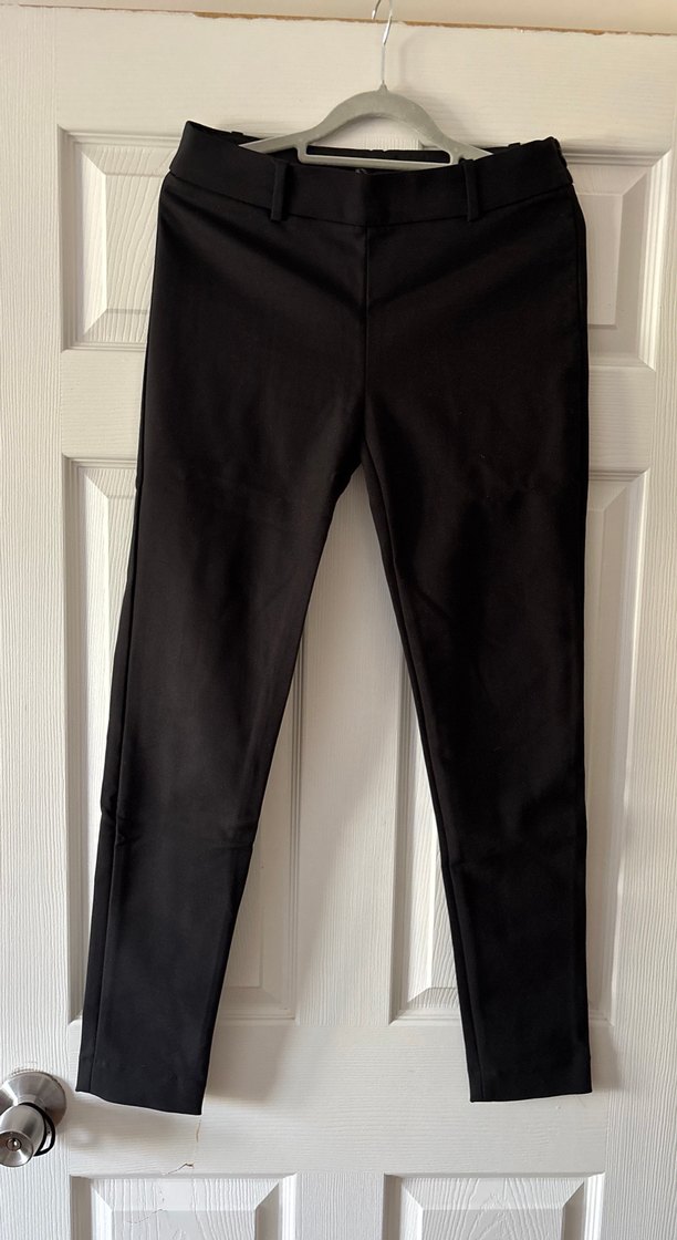 Siyah, düzenli kesim ve normal boy kadın kumaş pantolon. Pürüzsüz sentetik kumaştan, ofis için uygun sade normcore tarzda.