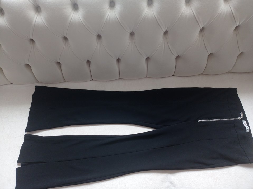 Siyah, yırtmaçlı, dar kesim kadın kumaş pantolon. Minimalist tarzda, ofis kullanımı için uygun, sentetik kumaştan yapılmıştır.
