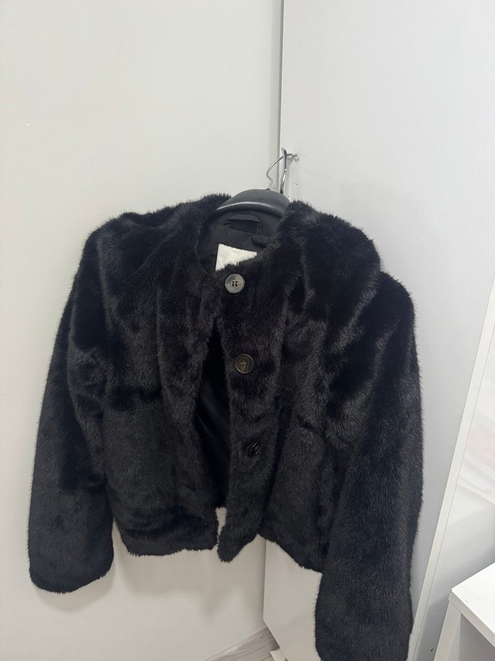 Yumuşak sahte kürk detaylı, uzun kollu, siyah ve fitted midi ceket. Rahat ve şık bir görünüm sağlar.