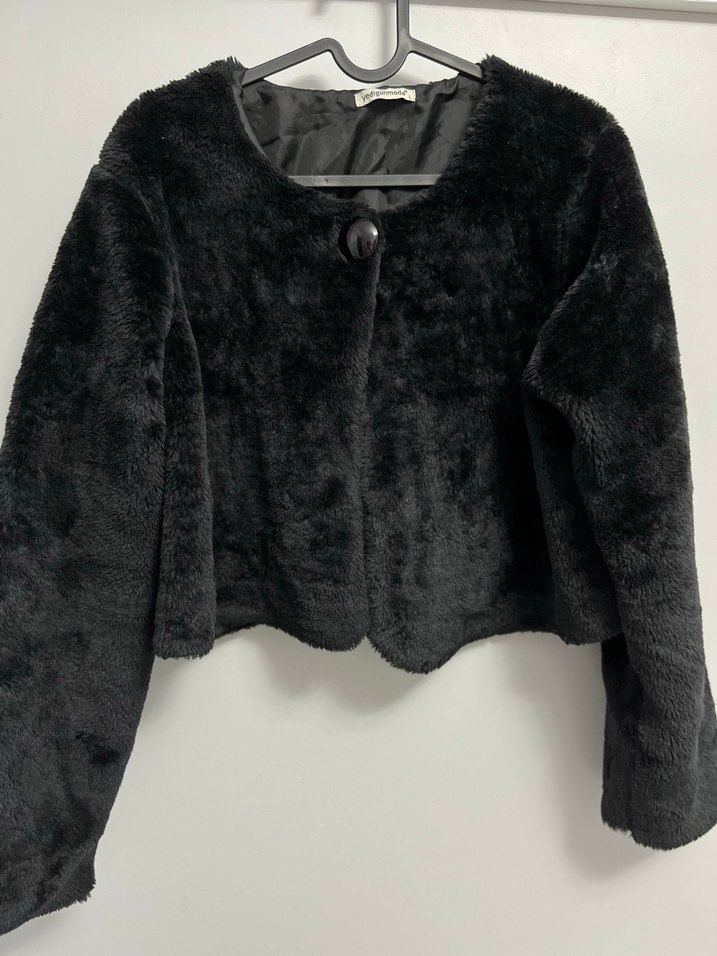 Siyah, kürk detaylı, tek düğmeli, uzun kollu, midi uzunlukta, rahat ve şık kadın ceketi. Ofis için uygun ve desen içermeyen tasarım.