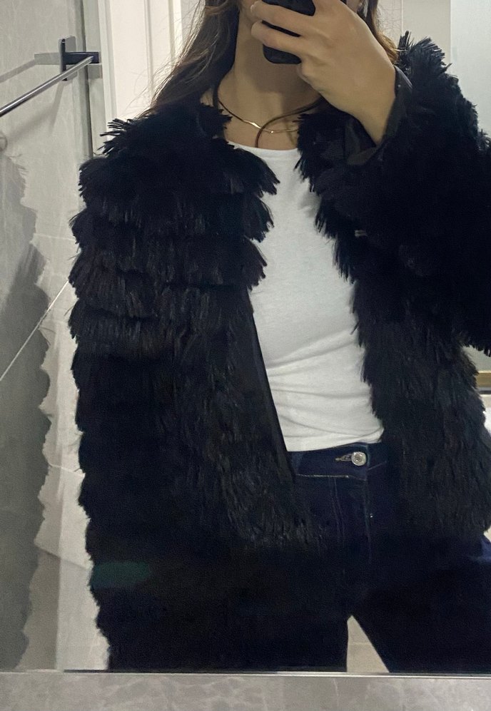 Bu siyah, kürk detaylı, uzun kollu ve yakalı ceket, rahat ve gotik tarzı günlük kullanıma sunar.