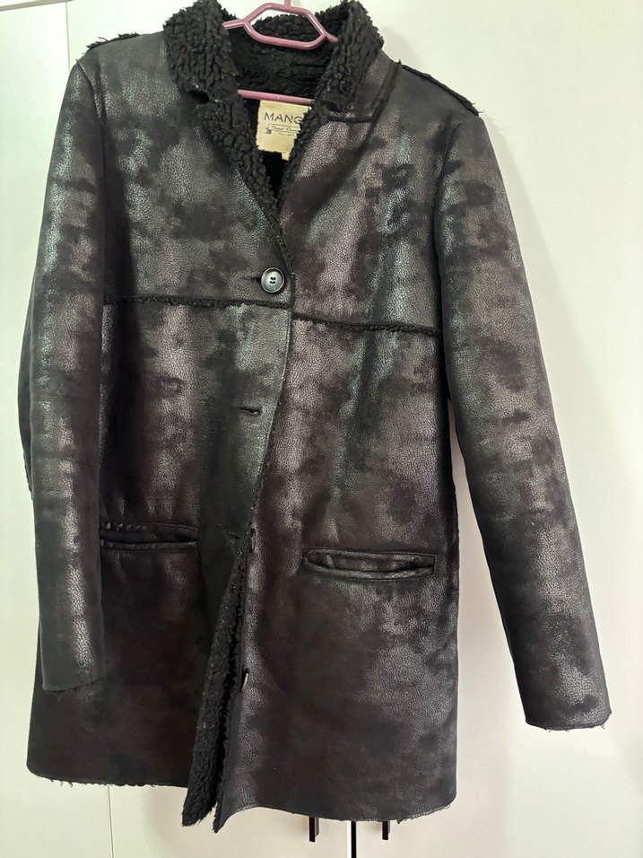 Siyah deri ceket, kürk detaylı ve kesimli yaka ile uzun kolludur. Midi boy, regular fit .
