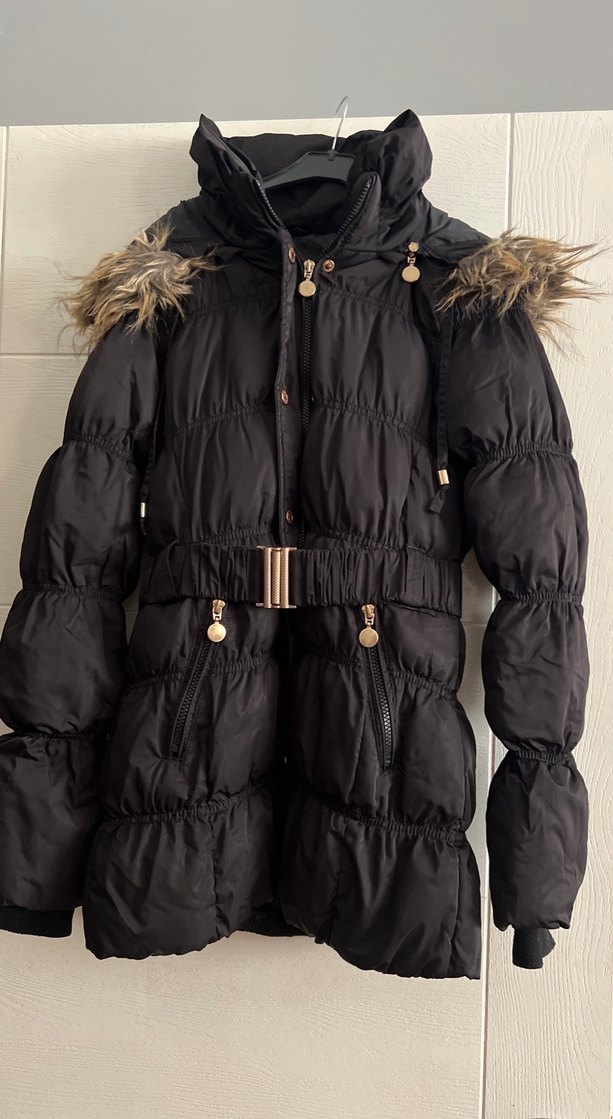 Fermuarlı, kemerli ve kürklü kapüşonlu siyah kış montu, rahat sentetik kumaştan, genç ve şık sokak stili için ideal.
