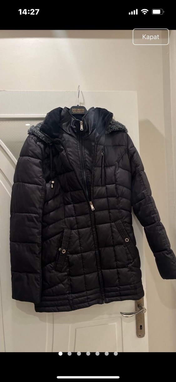 Siyah, kürklü detaylı, uzun kollu, normal boyda, kesimi vücuda oturan kadın kışlık mont. Günlük kullanıma uygun, rahat ve sıcak tutar.