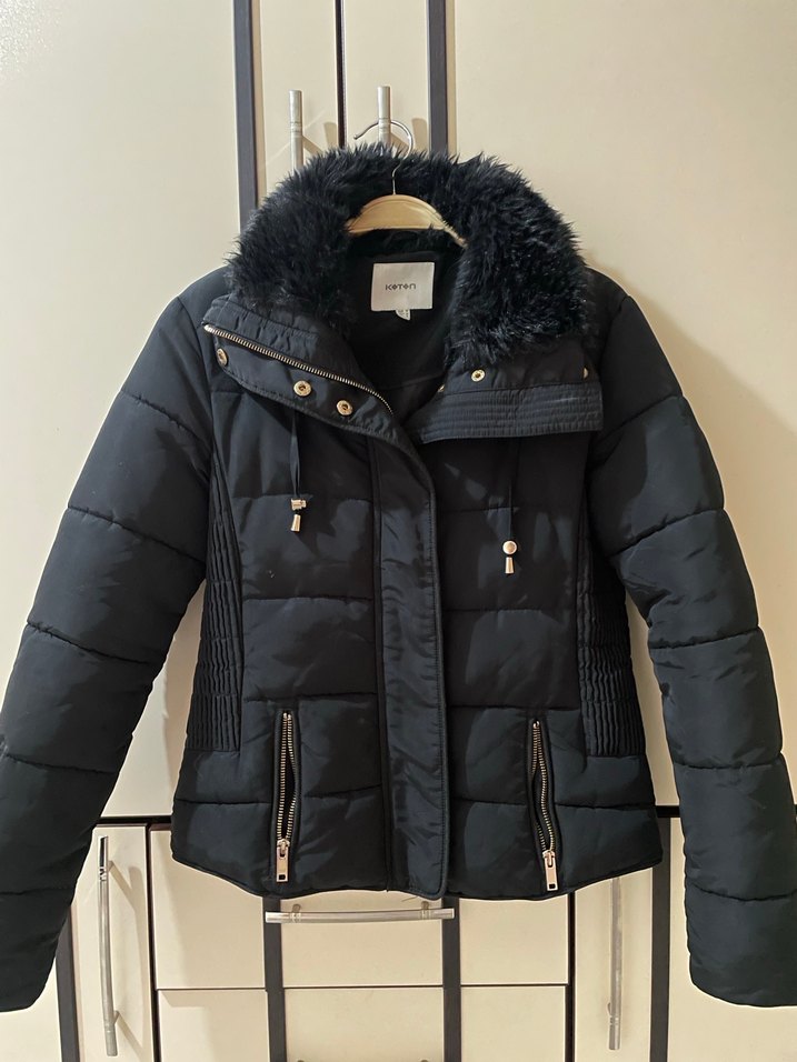 Siyah, kürklü yakalı, fitted kesim, strappy kollu, fermuarlı cepli, midi boy, rahat ve sıcak dokulu kışlık mont. ❄️