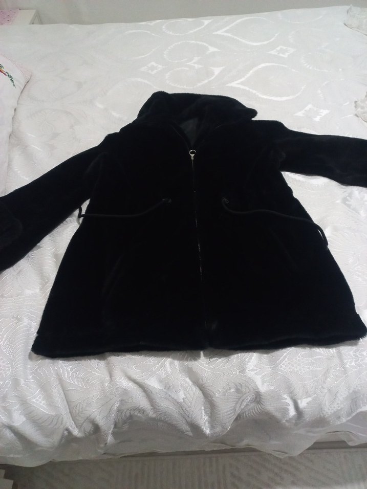 Siyah, uzun kollu, kürk detaylı midi kadın ceket. Notlu yakası ve rahat kesimiyle sıcak ve gotik bir tarz sunar.