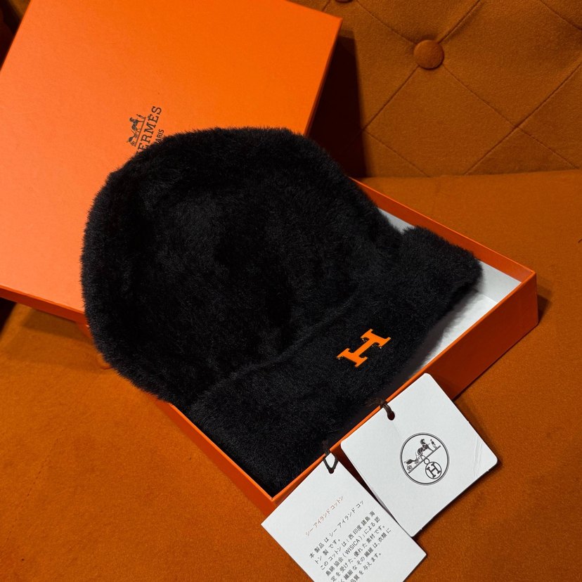 Siyah kadına özel, yumuşak ve sıcak kumaştan yapılmış, kürk detaylı ve turuncu 'H' logosu bulunan bere.