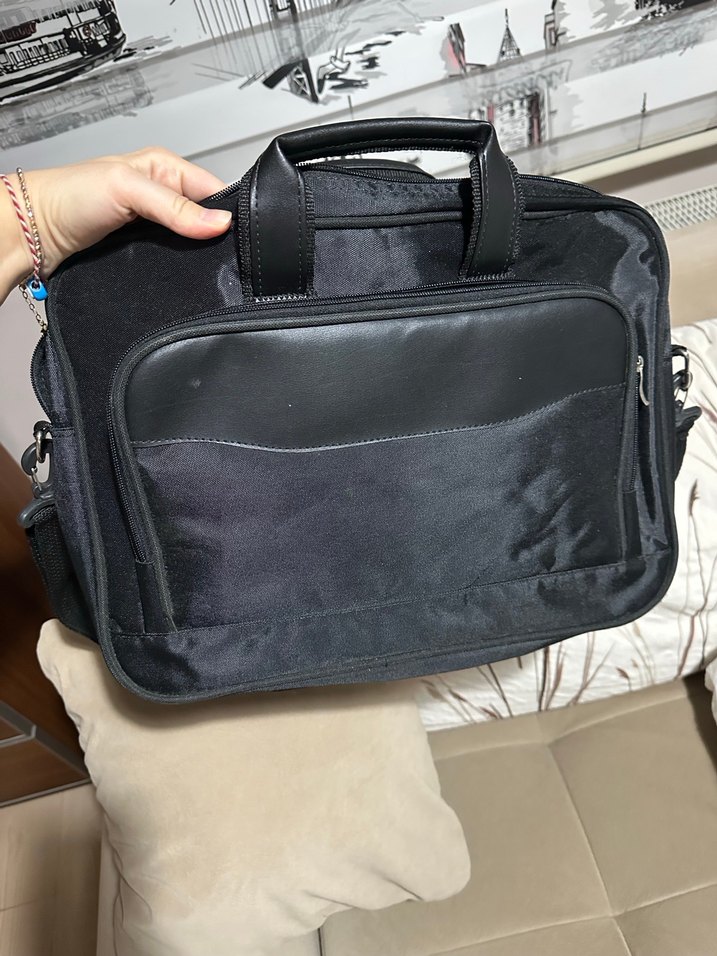 Siyah renkli, fermuarlı bölmeli kadın laptop çantası. Sentetik kumaştan yapılmış, sade ve gotik tarzda, ofis kullanımı için uygundur.