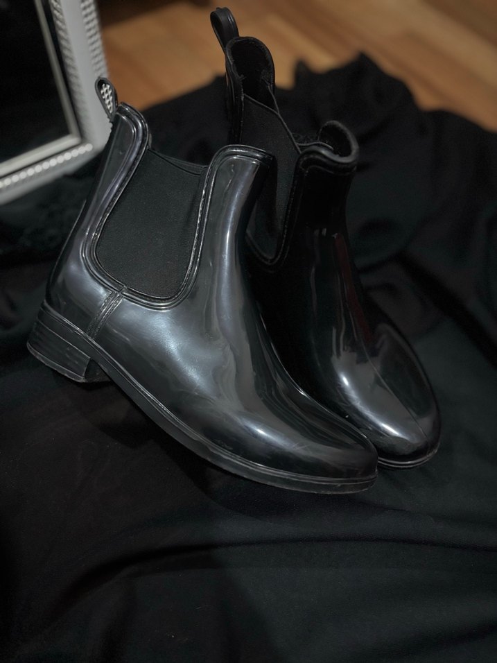 Siyah lastik malzemeden yapılmış, kadın botu. Günlük kullanıma uygun goth tarzında, şık ve rahat. Sol tekinin ön tarafında küçük bir çiziği var belli olmuyor giyince