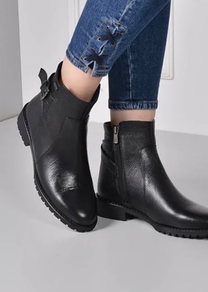 Siyah lastik kadın botları, tokalı ve kalın topuklu. Goth esintili sokak tarzı ile günlük kullanıma uygun.