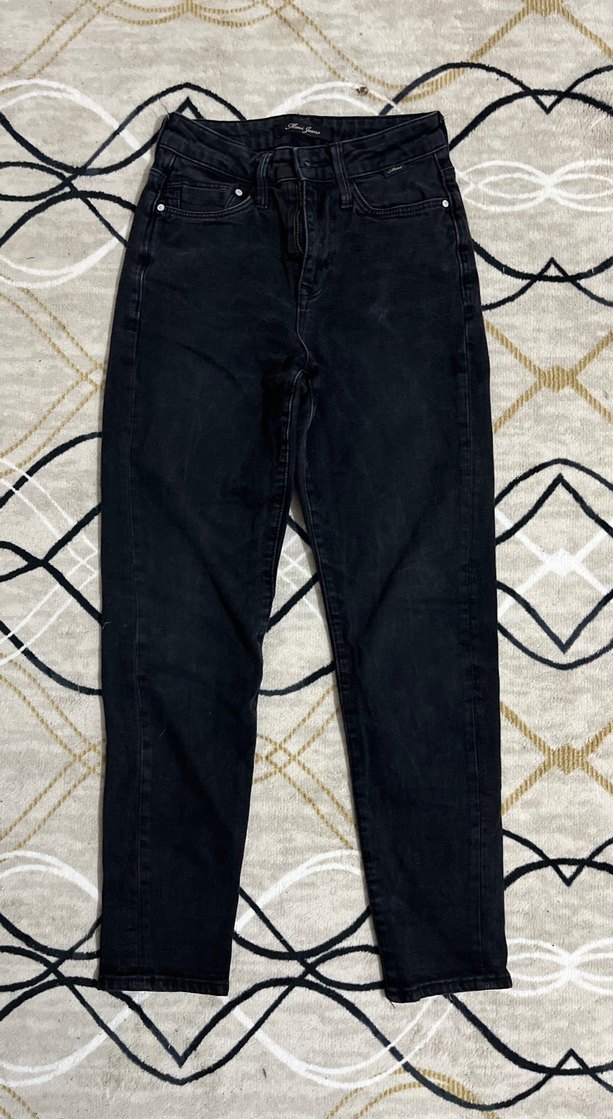 Siyah, midi boy, loose fit kadın denim jean. Günlük kullanıma uygun, rahat ve şık bir sokak stili pantolon.