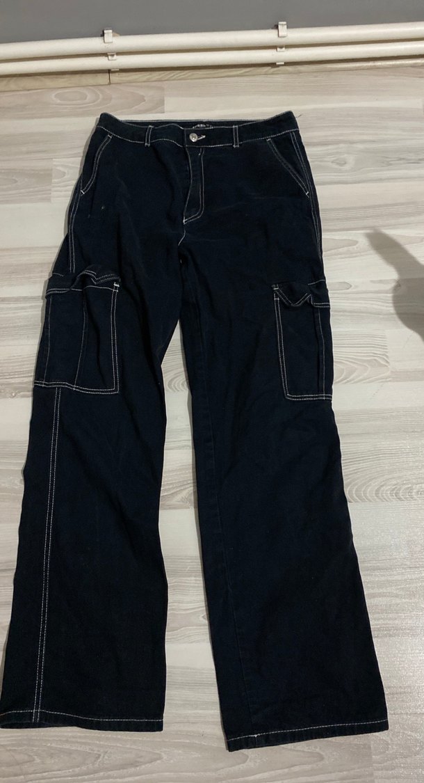 Siyah midi uzunlukta, bol kesim ve kemerli kadın kot pantolon. Sokak stili ve kullanışlı ceplere sahiptir. Günlük kullanım için uygun.