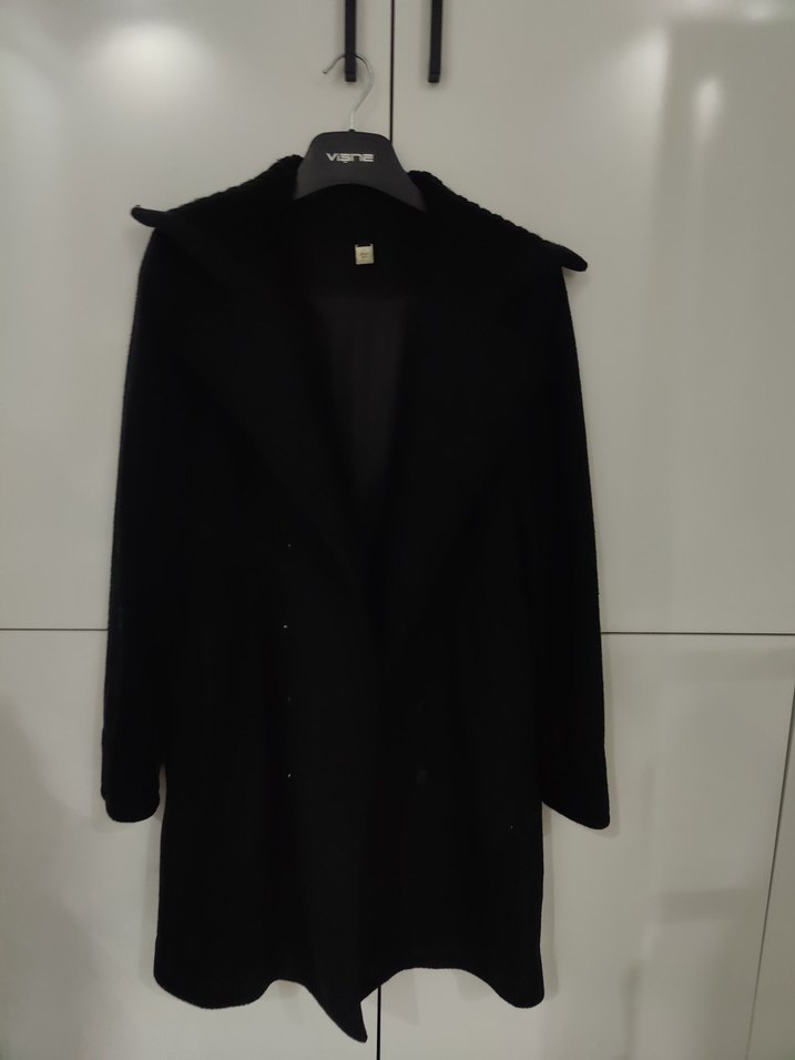 Siyah kadın kaban, kesik yaka ve uzun kollu, kemerli bel detayıyla. Uzun boy, regular fit ve yumuşak, sıcak tutan kumaştan üretilmiştir.